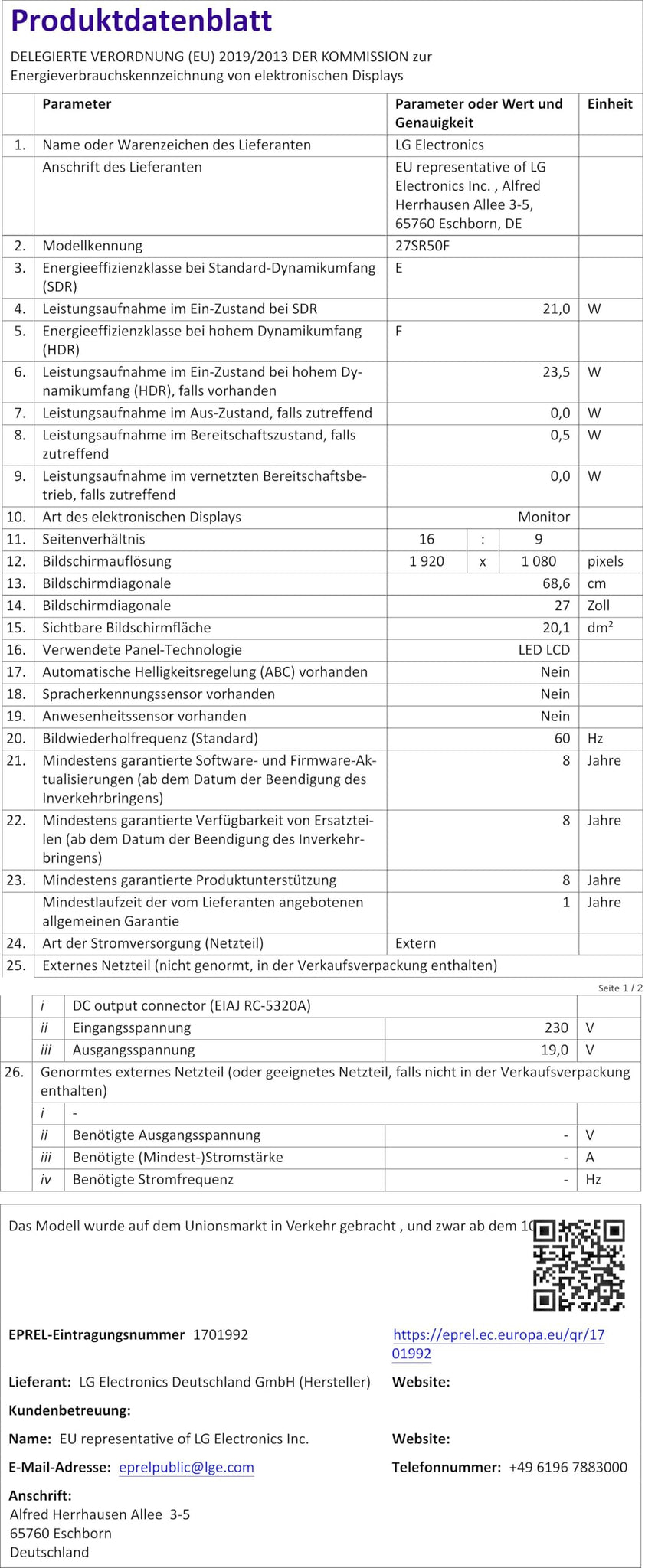 Einzelheiten: Der 27SR50F-W ist ein Full HD Multimedia-Monitor, der für Produktivität und Unterhaltung gleichermaßen geeignet ist. Mit einer Bildschirmdiagonale von 27 Zoll bietet das IPS-Panel sowohl Multimedia-Anwendungen als auch Arbeitsprogrammen genügend Platz. Der 27SR50F-W kann außerdem über einen USB-Stick als Mediaplayer verwendet werden und unterstützt HDMI CEC (eARC). Egal ob Musik genießen, fernsehen, streamen oder spielen – mit den smarten Extras von webOS 23 ist der Monitor für jede Situation bestens gerüstet.